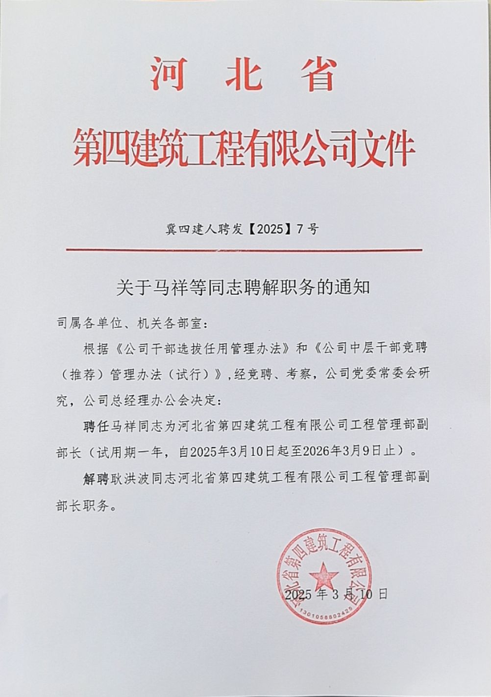 河北四建:关于聂玉辉等同志聘任职务的通知